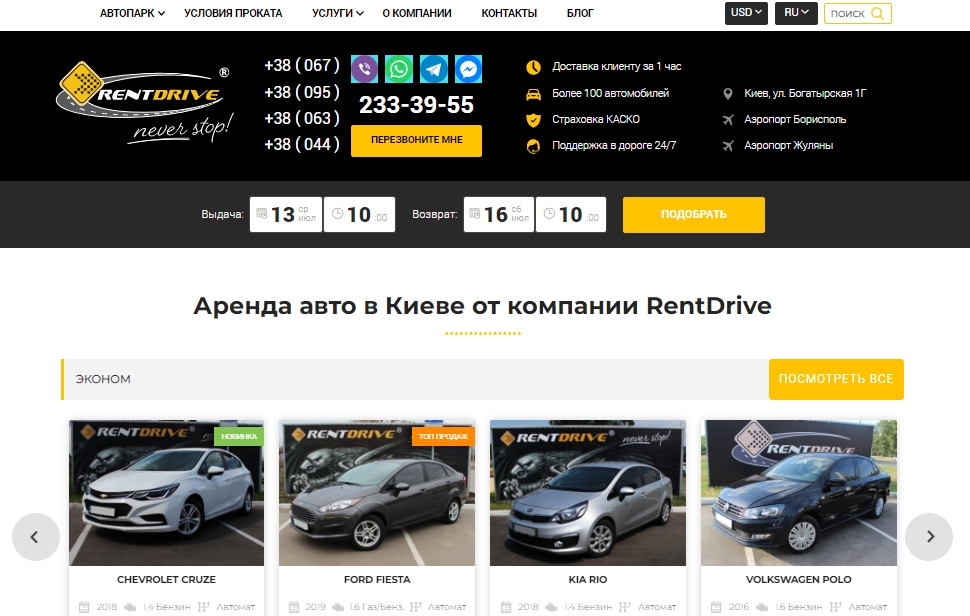 | Если Вы ищете авто в аренду – Вам к нам. Наша компания RentDrive предлагает услуги по прокату автомобилей в столице. На выбор клиентов более ста автомобилей разных марок и классов. Наши менеджеры предоставляют профессиональную консультацию и помогают выбрать автомобиль в соответствии с предпочтениями и финансами клиента. Наш сайт - https://rentdrive.ua/ , адрес - г.Киев, ул.Богатырская, 1Г, телефоны для получения консультации или бронирования авто - +38 (067)233-39-55, +38 (044)233-39-55, +38 (063)233-39-55, +38 (095)233-39-55.
